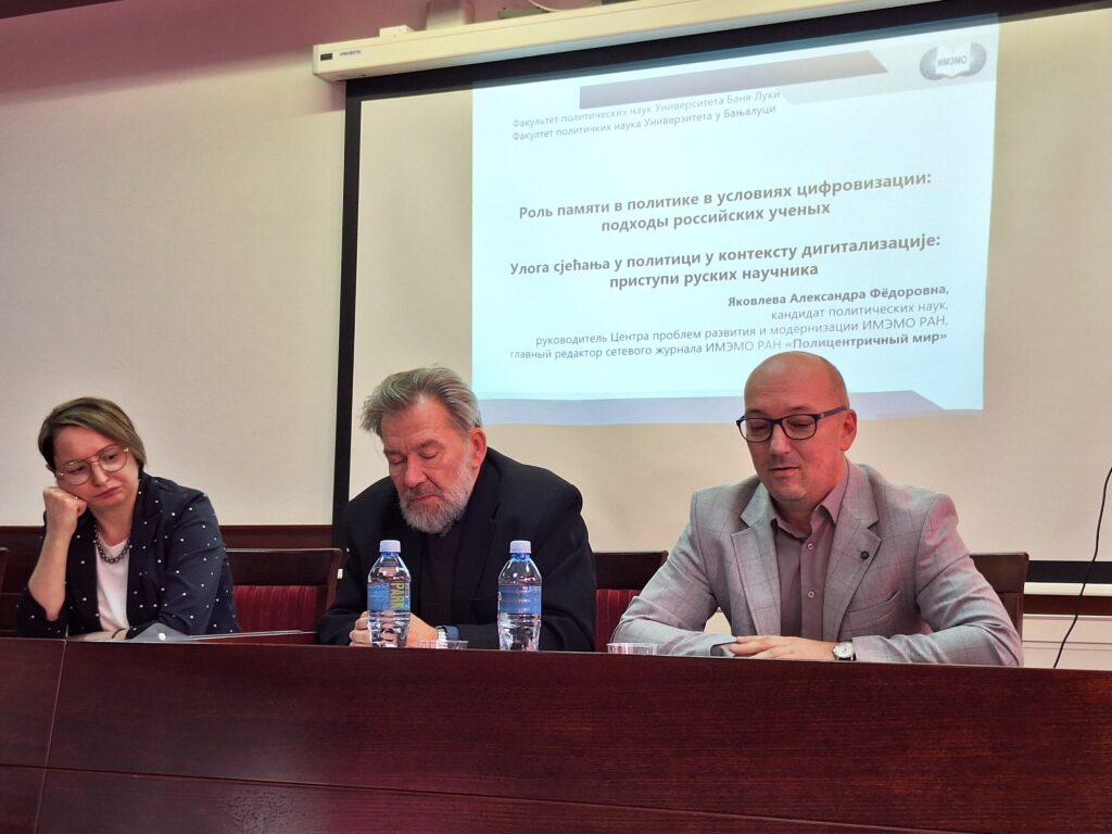Након тога, професорица Александра Фјодоровна Јаковљева, руководилац Центра за питања развоја и модернизације у Институту за свјетску привреду и међународне односе (ИМЕМО) при Руској академији наука, представила је своје истраживање на тему „Улога сјећања у политици у контексту дигитализације: приступи руских научника“. У оквиру предавања говорила је о изазовима дигиталног доба у очувању колективног сјећања и политичког идентитета.