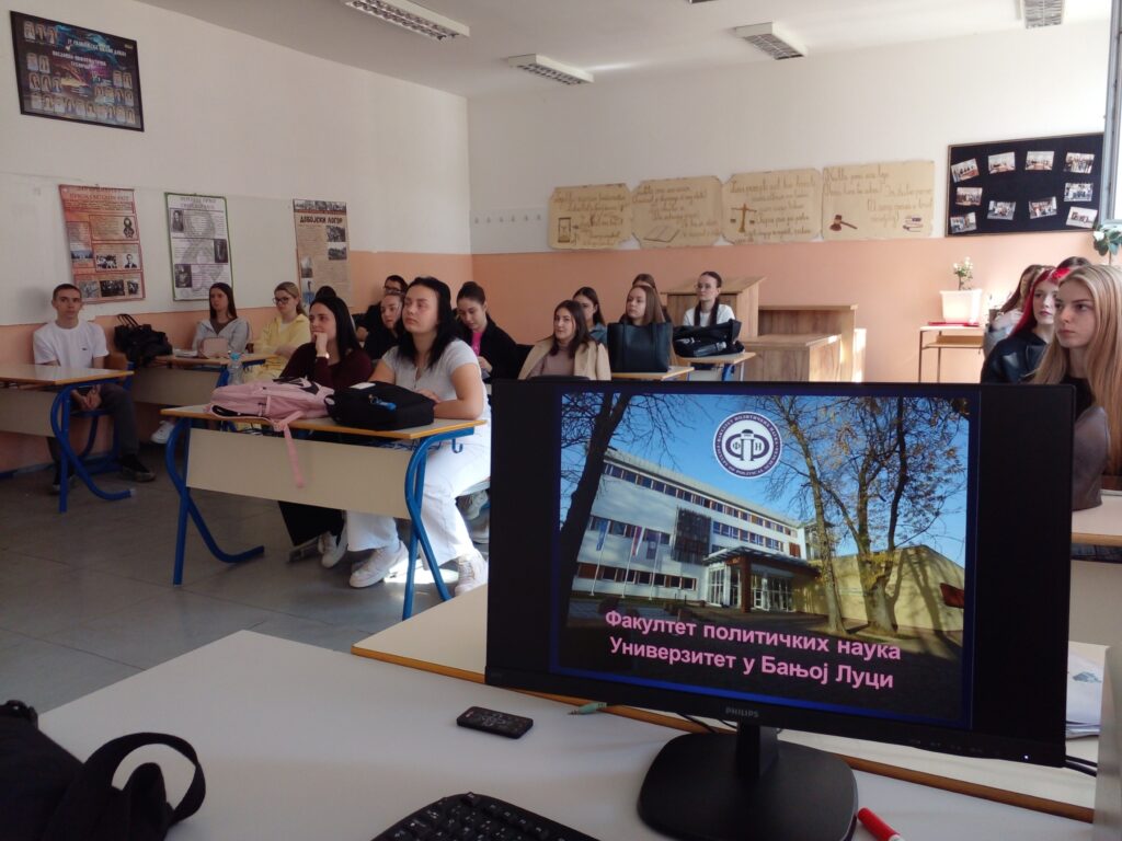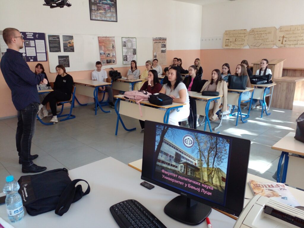 Факултет политичких наука промовисан је ученицима четвртог разреда Економске школе у Добоју. Асистент Марко Симић матурантима је представио начин рада Факултета, структуру студија, академске могућности, ваннаставне активности, прилике за размјену студената као и могућности каснијег запослења. Заинтересованим ученицима је појашњен процес уписа на факултет и полагања пријемног испита.
