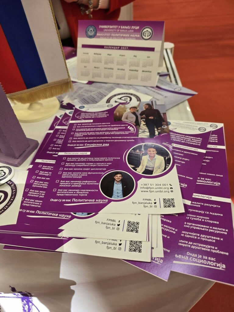 Посјетиоци сајма имали су прилику да се упознају са понудом факултета, укључујући студијске смјерове из области политичких наука, социологије, социјалног рада и новинарства и комуникологије.