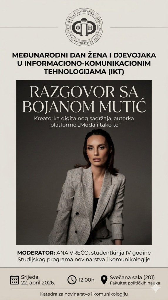 Поводом Међународног дана жена и дјевојака у информационо-комуникационим технологијама (ИКТ), Катедра за новинарство и комуникологију организује разговор са Бојаном Мутић, креаторком дигиталног садржаја и ауторком платформе „Мода и тако то“. Разговор ће водити наша студенткиња четврте године Студијског програма новинарства и комуникологије Ана Врећо. Догађај ће се одржати у сриједу 22. априла 2026. године у 12 часова у свечаној сали (201) Факултета.