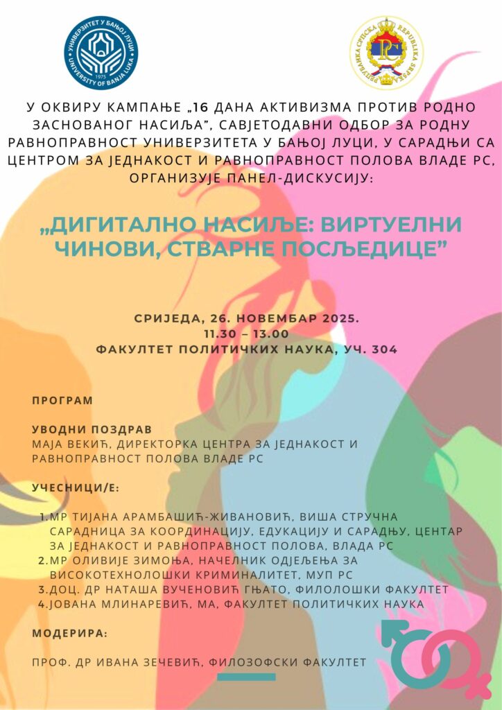 У оквиру кампање „16 дана активизма против родно заснованог насиља“, Савјетодавни одбор за родну равноправност Универзитета у Бањој Луци у сарадњи са Центром за једнакост и равноправност полова Владе Републике Српске, организује панел дискусију „Дигитално насиље: виртуелни чинови, стварне посљедице“.