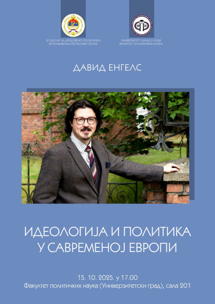 Предавање Давида Енгелса под називом „Идеологија и политика у савременој Европи“ биће одржано 15.10.2025. године у 17:00 часова у сали 201 Факултета политичких наука Универзитета у Бањој Луци.