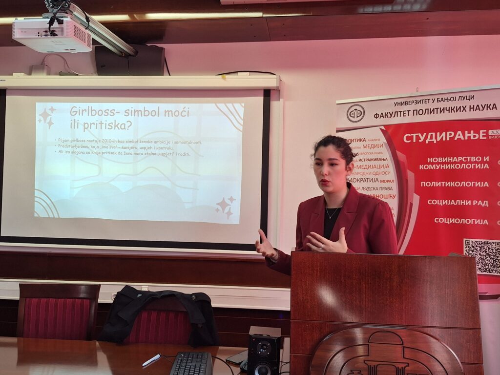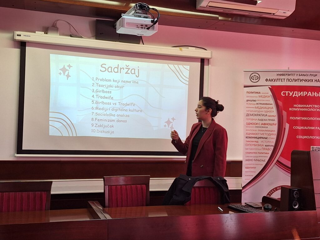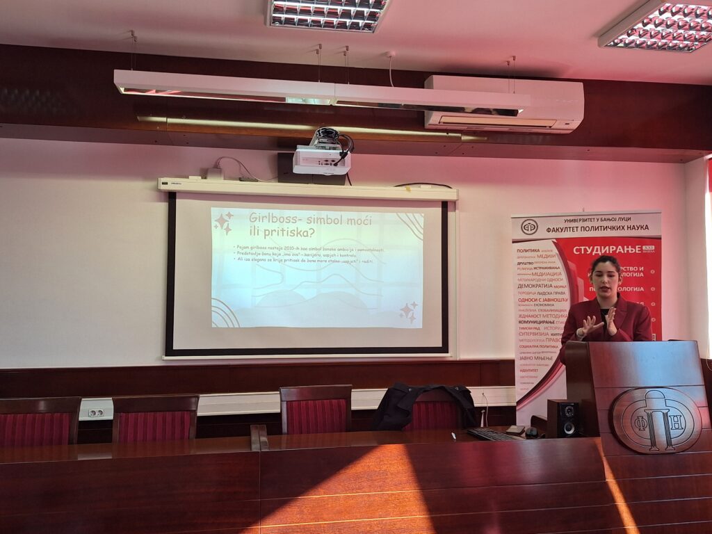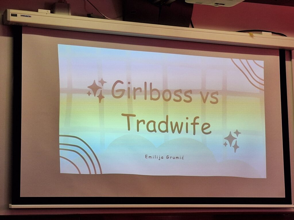 Прву презентацију под називом „Girlboss vs Tradwife“, представила је студенткиња треће године Емилија Грумић. Емилија је говорила о два савремена модела женског идентитета – „дјевојци шефици“ и „традиционалној супрузи“, те анализирала њихов утицај на положај жена у друштву и питање да ли они доносе оснаживање или нове облике друштвеног притиска.
