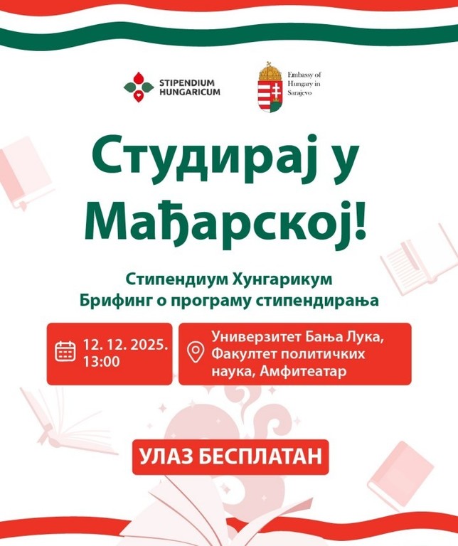 Презентација програма стипендија Владе Мађарске ,,Stipendium Hungaricum” биће одржана у петак, 12. децембра 2025. године, у амфитеатру Факултета политичких наука Универзитета у Бањој Луци, са почетком у 13.00 часова.